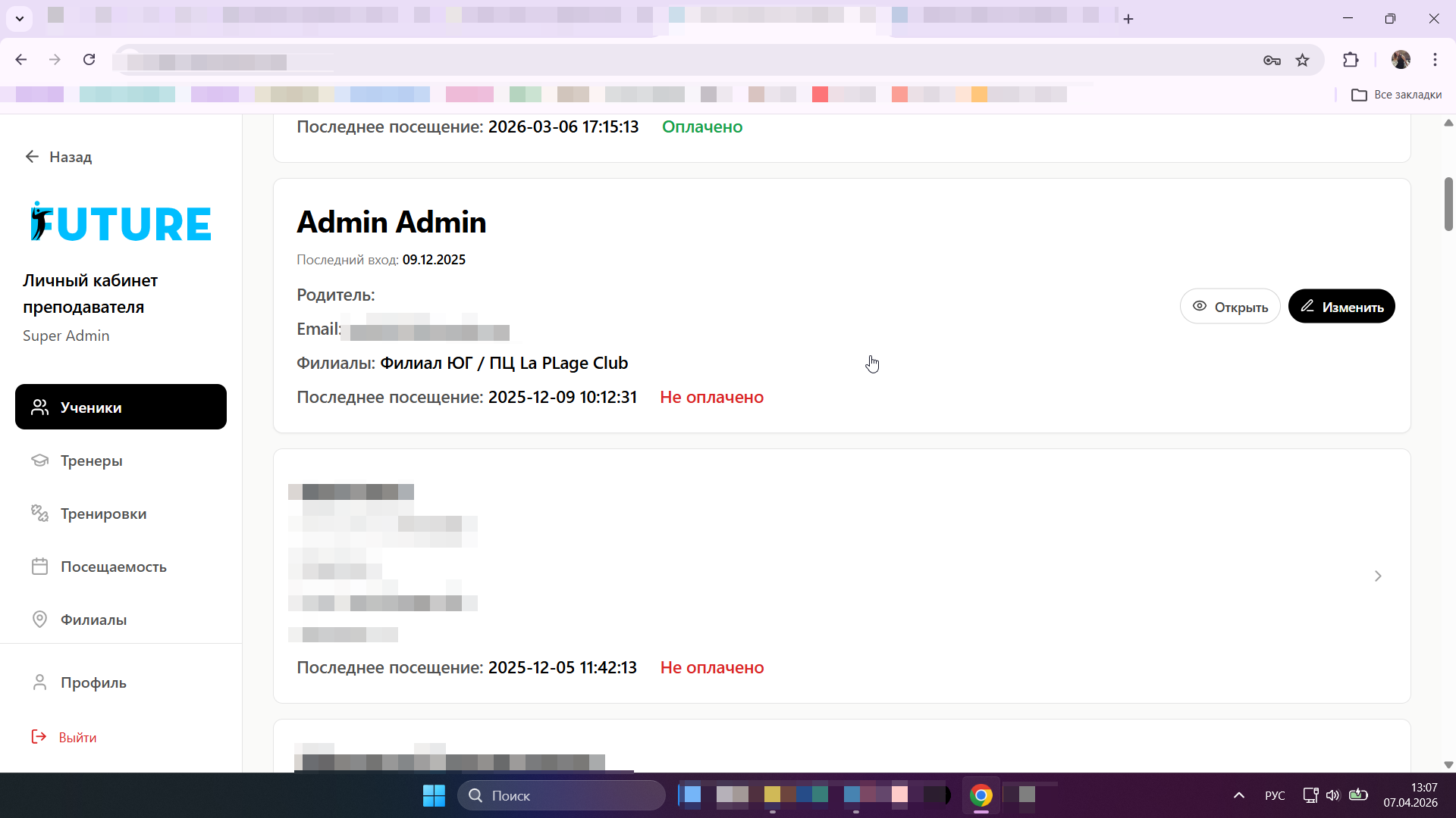 Электронный дневник посещений, где виден остаток занятий, история оплат и прогресс. Реализована система «заморозок» и быстрых уведомлений.